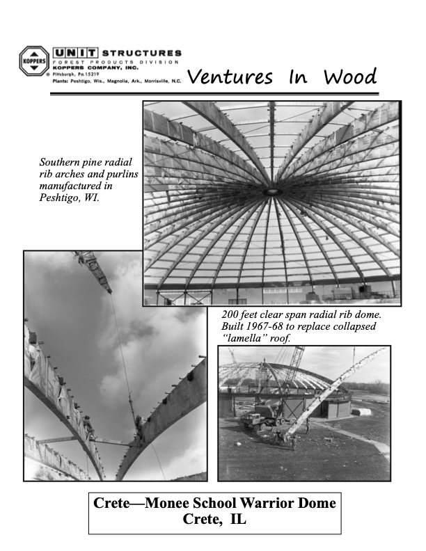 The now demolished Warrior Dome at the former Crete-Monee High School was also made using Glulam. A press release on the construction of the dome, shows some great photos of the process.