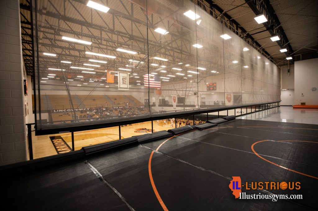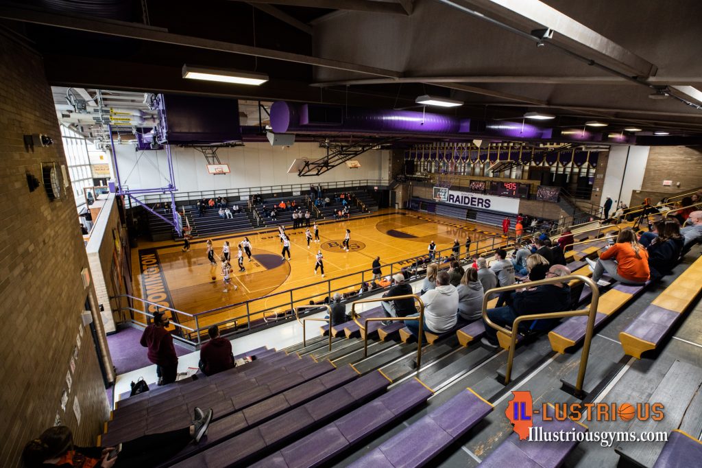 The two tier system is a popular way to increase seating if your teams generally draw a larger crowd, but with the added bonus of being able to conduct multiple activities in the same gym at once. Gyms like Lincoln-Way West (below) have a drop screen that enables practices or secondary games to be played with little chance of stray balls interfering with the other games.